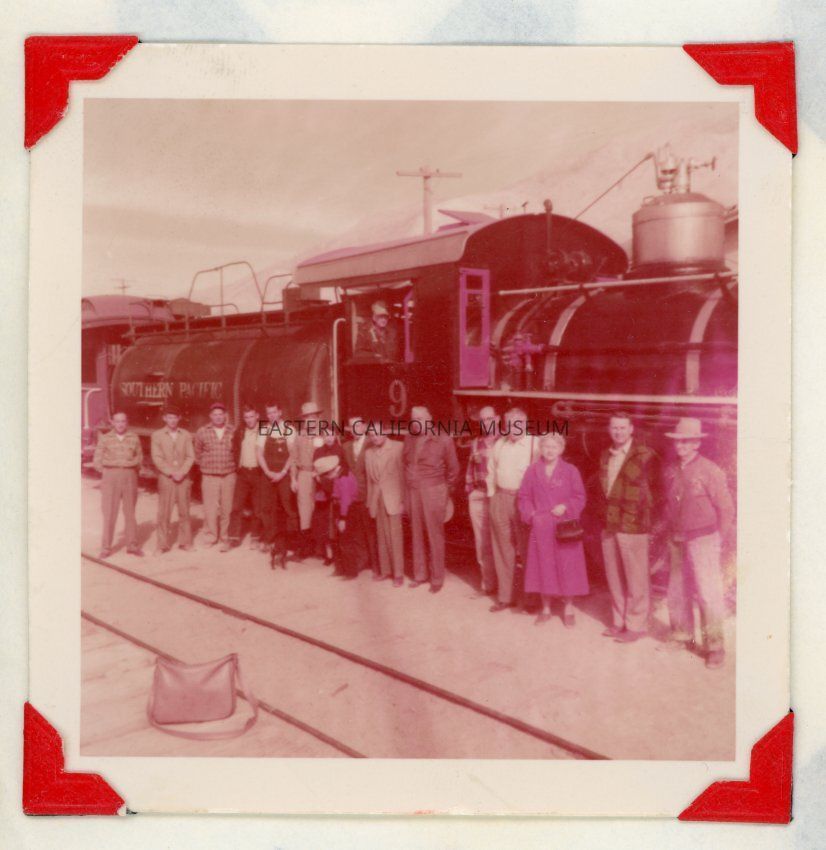 Color photo of a group of people posing in front of Southern Pacific engine #9 at Owenyo on 11/11/1956. It was an Owens Inyo Co. excursion from Owenyo to Keeler.