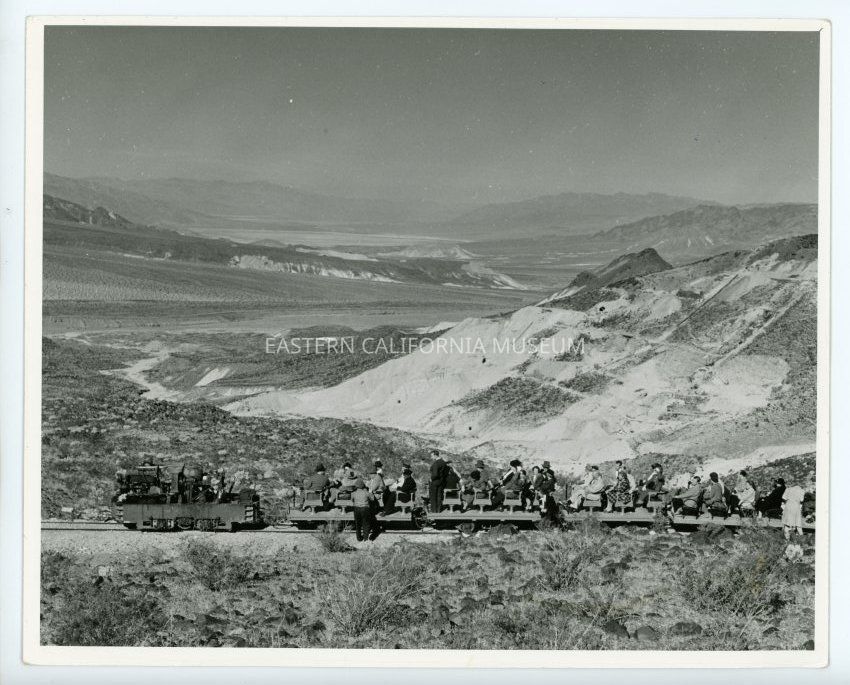Photo of people riding the baby gauge railroad at Ryan in the Amargosa mountain range.
