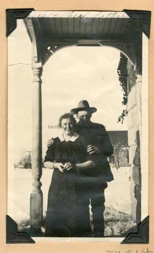 Photo of a man and young girl standing together under a covered patio. The building appears to be constructed from stone. There is a lot of snow on the ground around them. It is labeled, "Agnes and her father."Collection