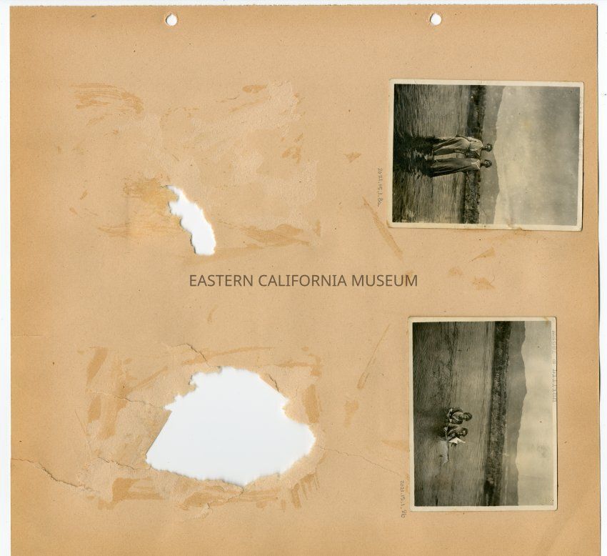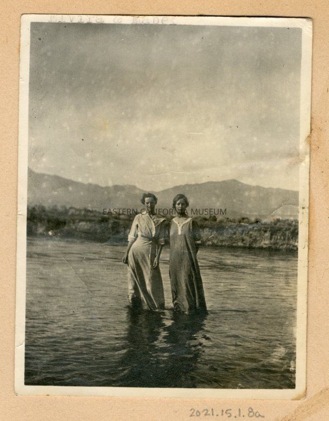 Photo of two young women standing in what appears to be the Owens River or other body of water. They are wearing dresses and the water is knee-deep or shallower. Indistinct mountains in background.