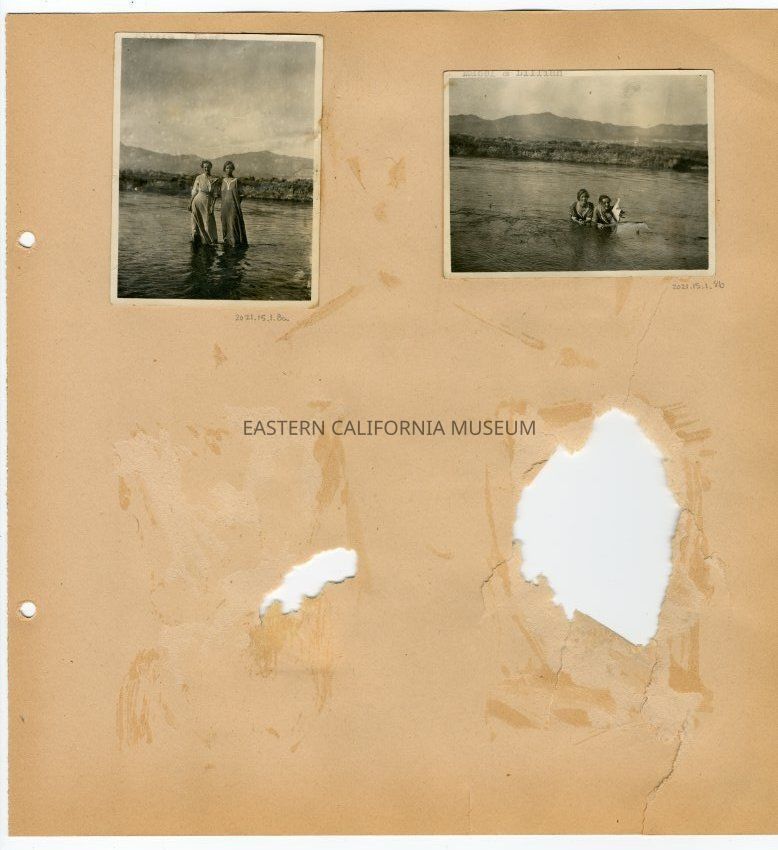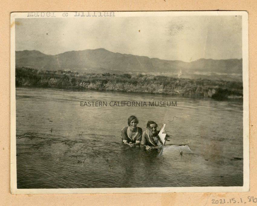 Photo of two young women laying on their stomaches (on a sandbar?) in what appears to be the Owens River or other body of water. They are wearing dresses. Indistinct mountains in background.