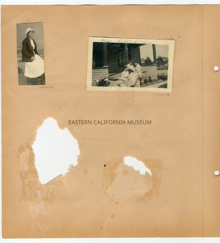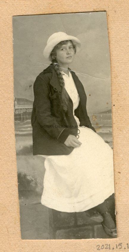Studio portrait of an unidentified young girl sitting on a stool. The backdrop appears to be a pier and ocean scene. She is wearing a white hat and dress with a dark colored jacket. The photo has been trimmed.Collection