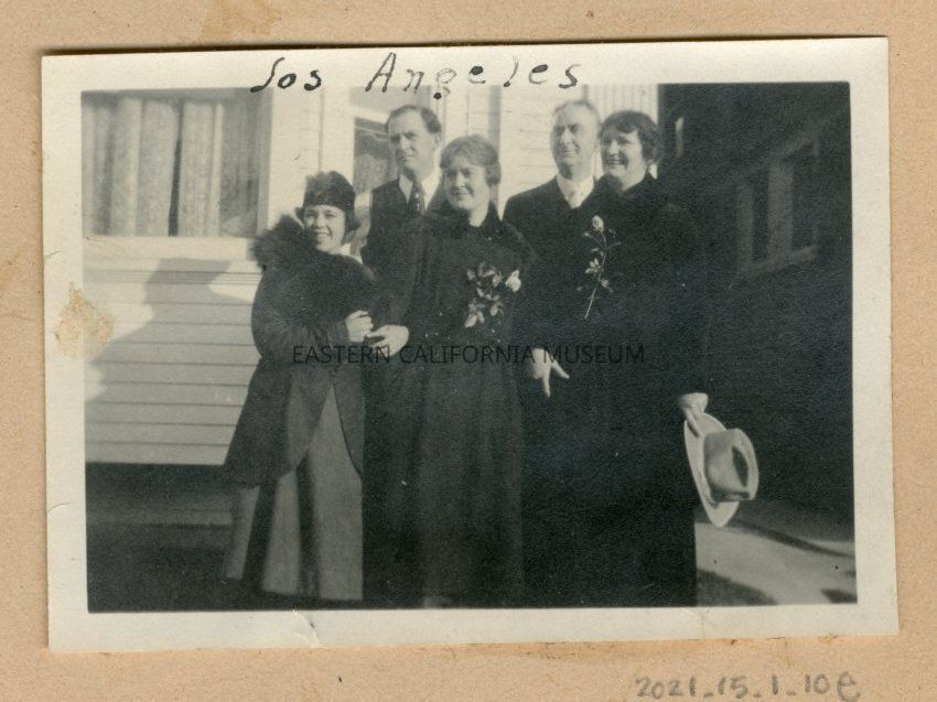 Photo of five people standing outside of a house. There are three women and two men. Location is identified as Los Angeles. It appears to be the same location as 2021.15.1.10d.Collection
