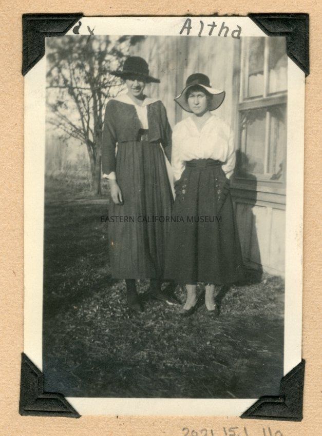 Photo of two women standing outside a house. They are identified as Max and Altha.