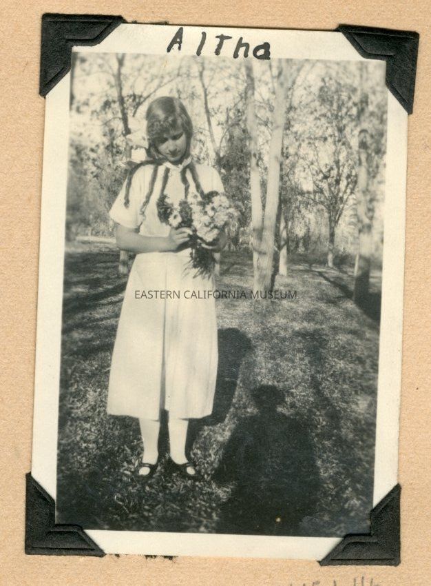 Photo of a young woman wearing a white dress standing outside holding a bouquet of flowers. She is identified as Altha.