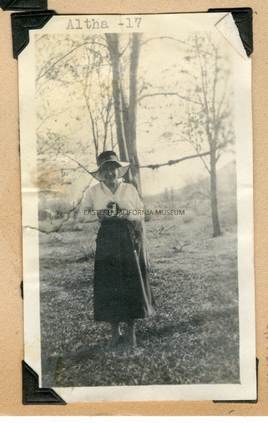 Photo of a young woman holding a camera outside. She is identifed as Altha, and she is either 17 years old or the photo was taken in 1917.