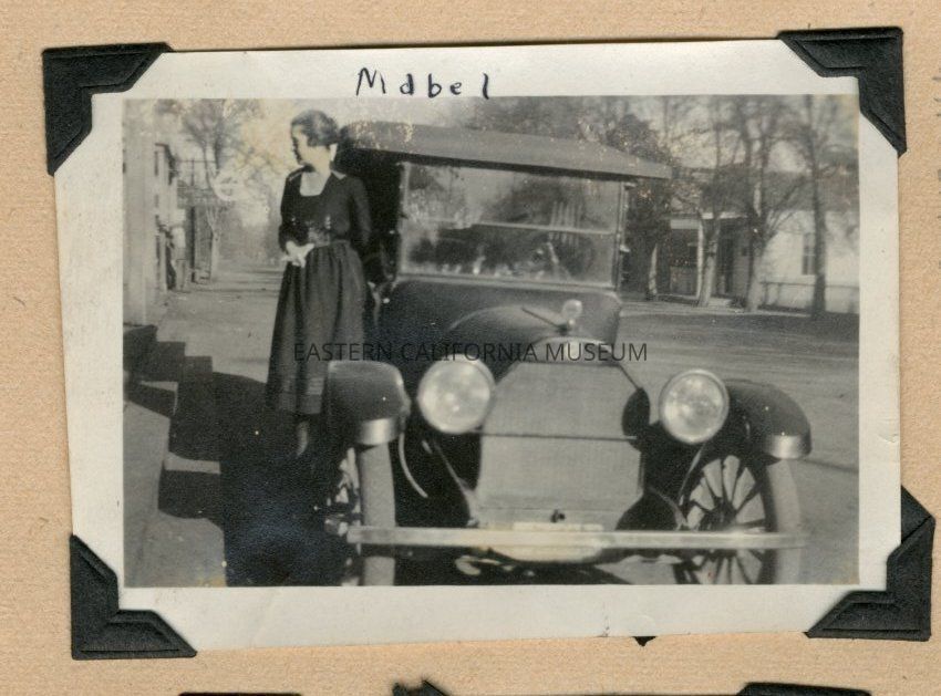 Photo of a young woman standing on the running board of an old vehicle parked on a street. She is identified as Mabel, and there are buildings (stores and/or houses) in the background.Collection