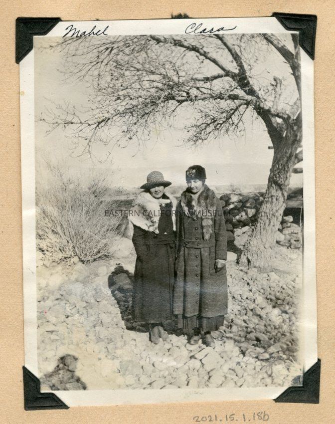 Photo of two women wearing long coats and fur stoles (fox?) standing in a rocky area. Maybe part of a stone wall behind them? They are identified as Mabel and Clara. Written in lower right corner is "3-18."Collection