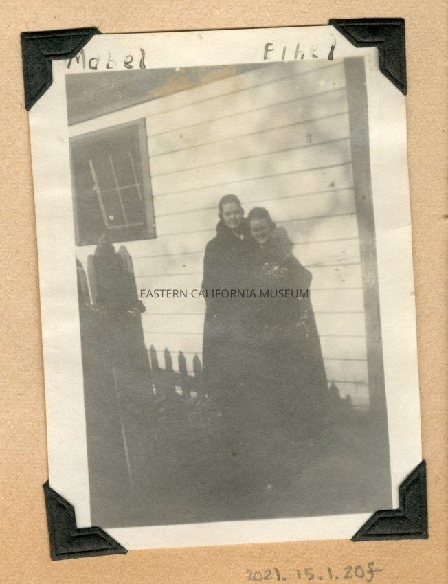 Photo of two young women standing by a house and fence. They are identified as Mabel and Ethel.