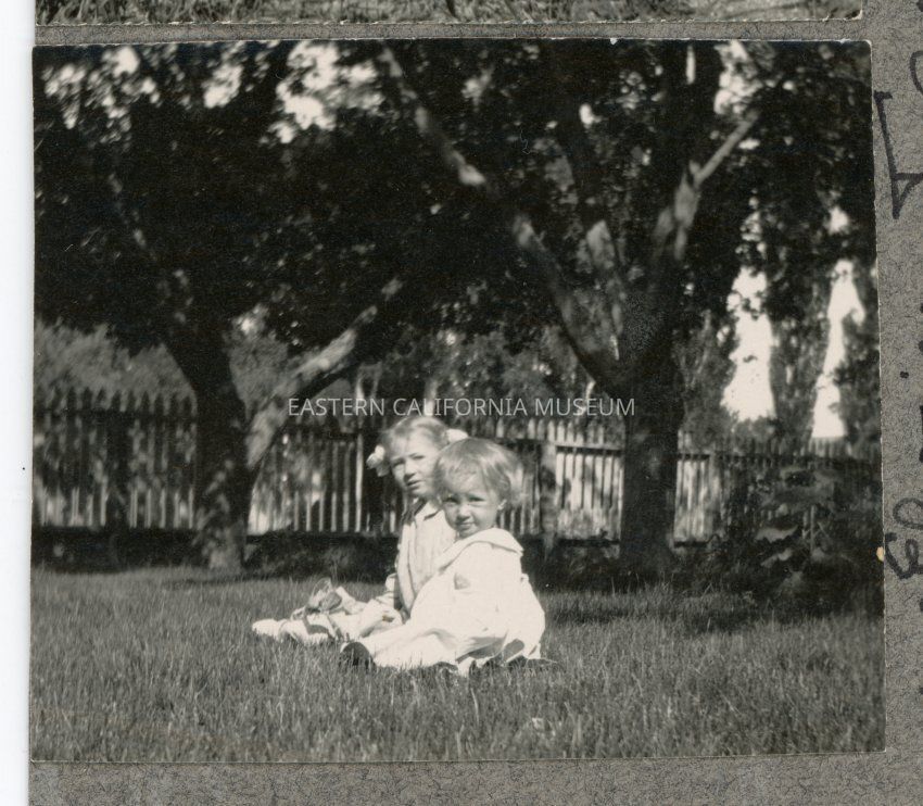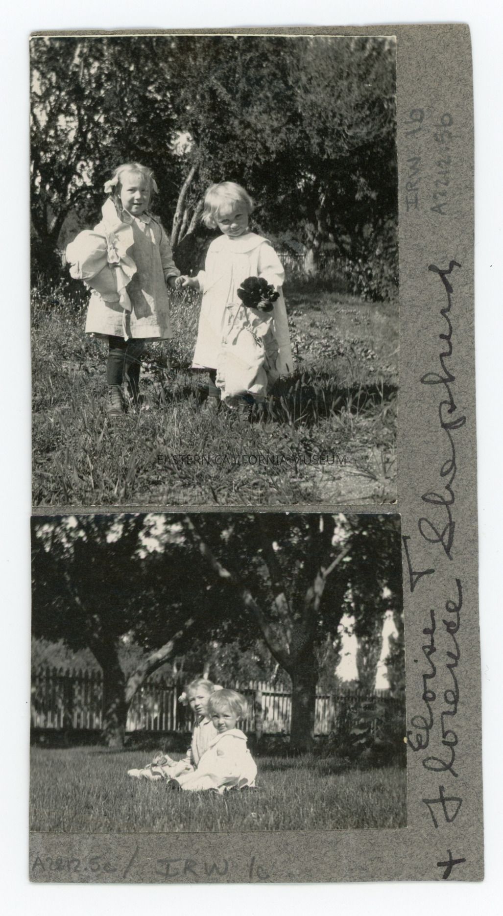 A1831.2.73d: Exterior photo of Eloise and Florence Shepherd playing in a grassy lawn. There is a white picket fences and mature trees behind them.