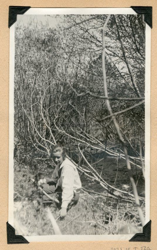 Photo of a young person sitting by a river bank. There may be a wooden bridge across the creek.