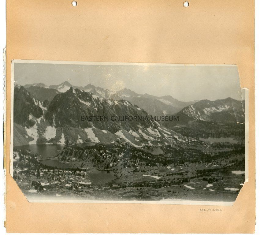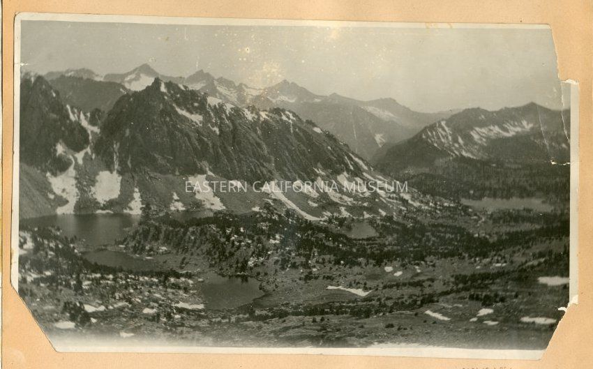 Large photo of mountain lakes and small patches of snow. Identified as Kearsarge Lakes as seen from the upper trail by LL in 2021.