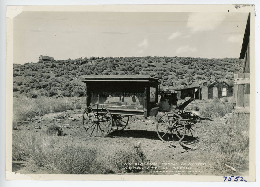 An Old Time Hearse in Aurora "A Ghost City" of Nevada Frashers Foto Pomona 7552 This photo is loose, but appears to have been torn out of an album. It is printed on Velox paper.
