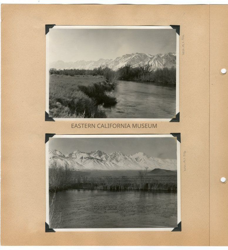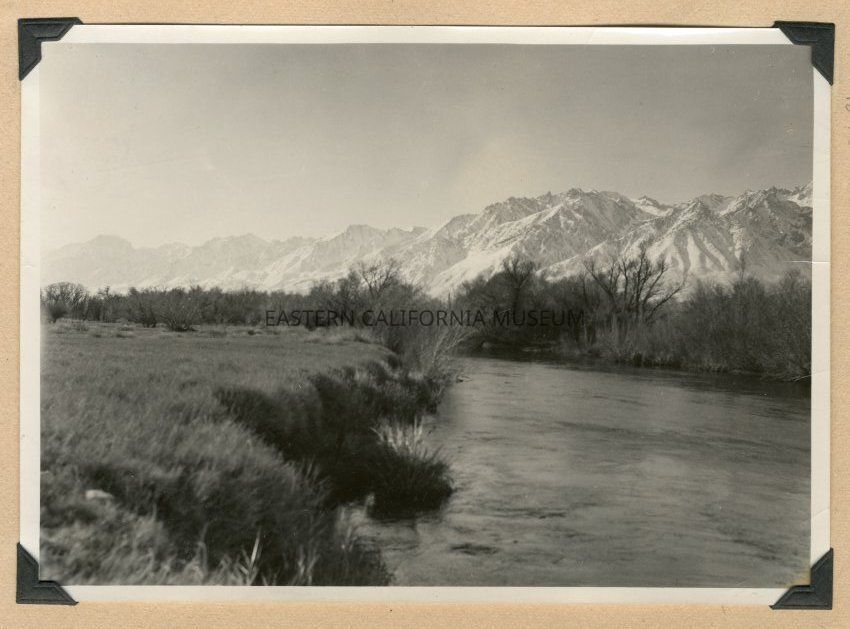Photo of the Owens River with the snow-capped Sierra Nevada mountain range in the background.