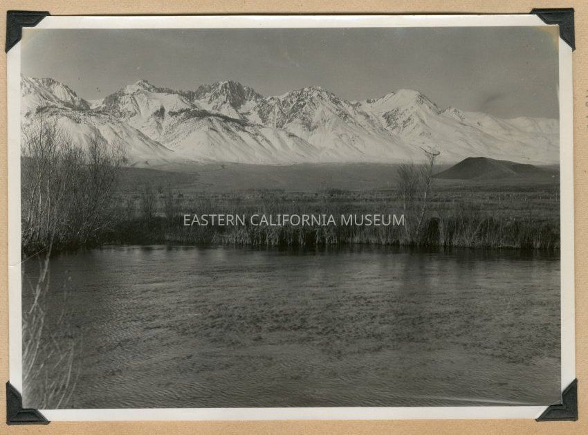 Photo of the Owens River with the snow-capped Sierra Nevada mountain range in the background. Red Mountain visible to the right.