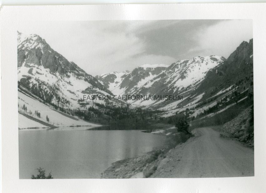 B&W matte print: lake with dirt road alongside, snowy mountains