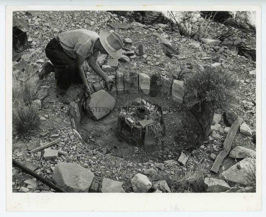 Hungry Bill's area in Panamint Range, showing an old arrasta. Stamped on back with "Dwight Bentel". Written on reverse is "#2".