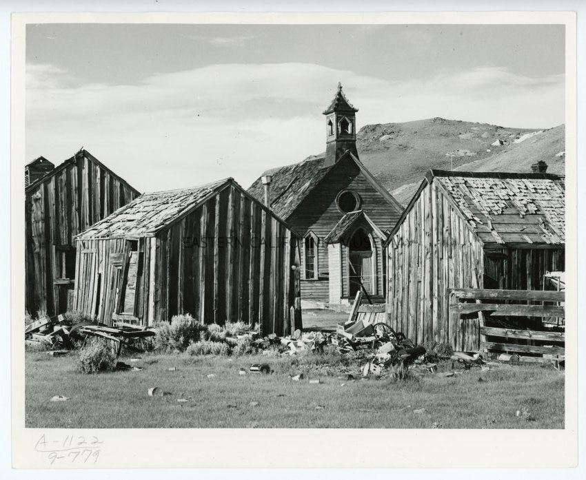 Photo of ruins in the town of Bodie, including a church with steeple.