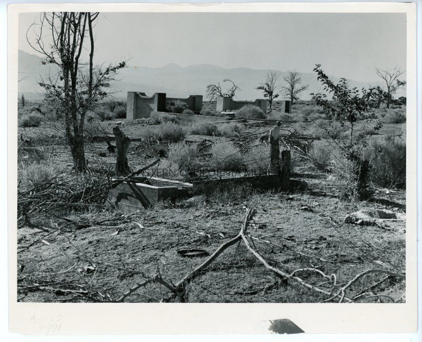 Stamped on back with, "Dwight Bentel." Written in black ink on reverse, "Owens Valley showing wreckage of the Owens Valley after Los Angeles water grab. Deserted homes and ranches."