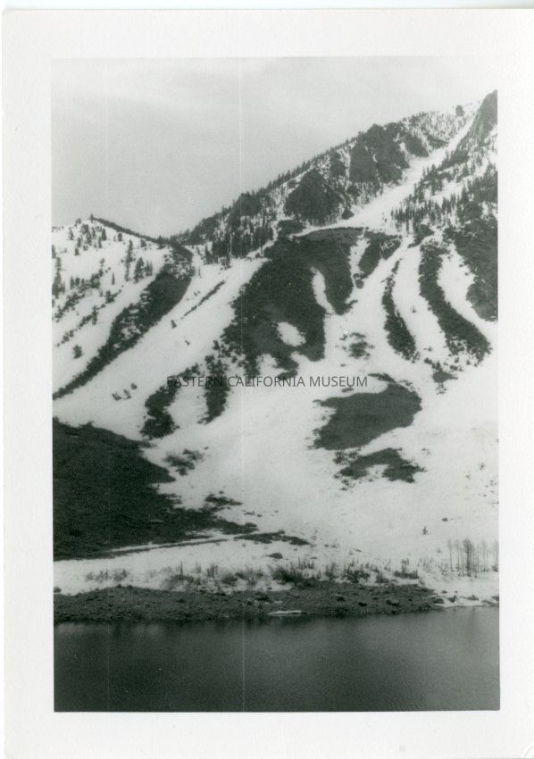 B&W matte print: lake with snowy slope coming to water's edge