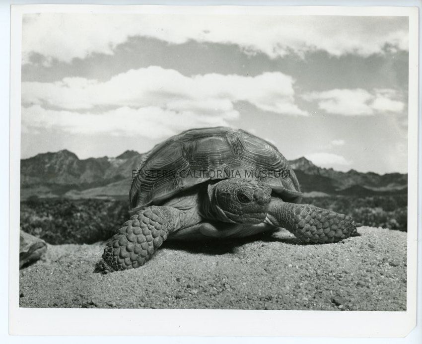 Close up photo of a desert tortoise. Label on reverse: Desert tortoise in tortoise protected area west of Randsburg.