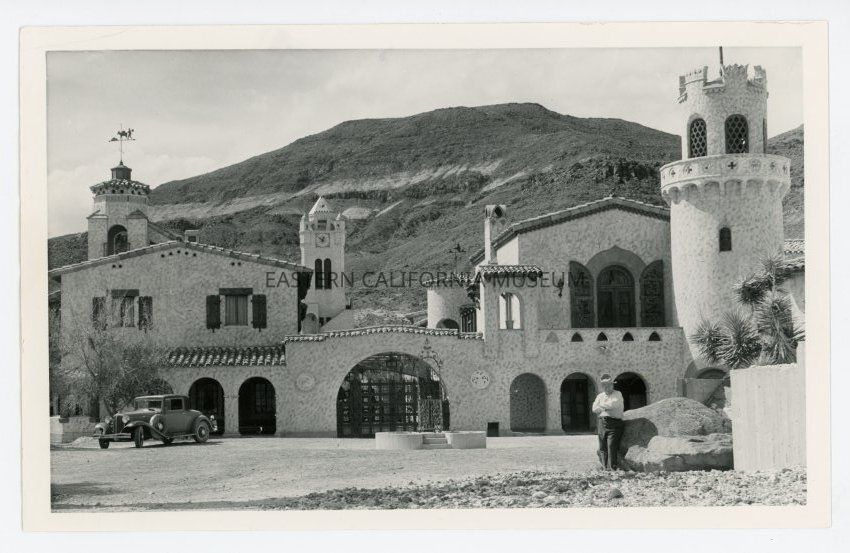Photo of Death Valley Scotty posing in front of Scotty's Castle. There is a vehicle parked in front.