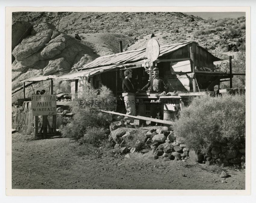 Photo of a man and woman standing in front of a shack. It looks like a miner's or prospector's shack.