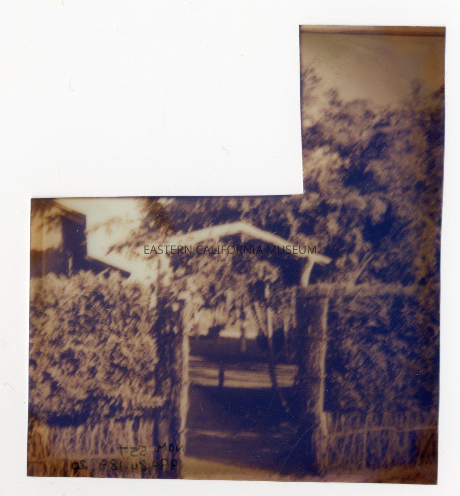 Small color photo of a wood archway over a path at Manzanar War Relocation Center. There is lots of vegetation growing around it.Photograph Details