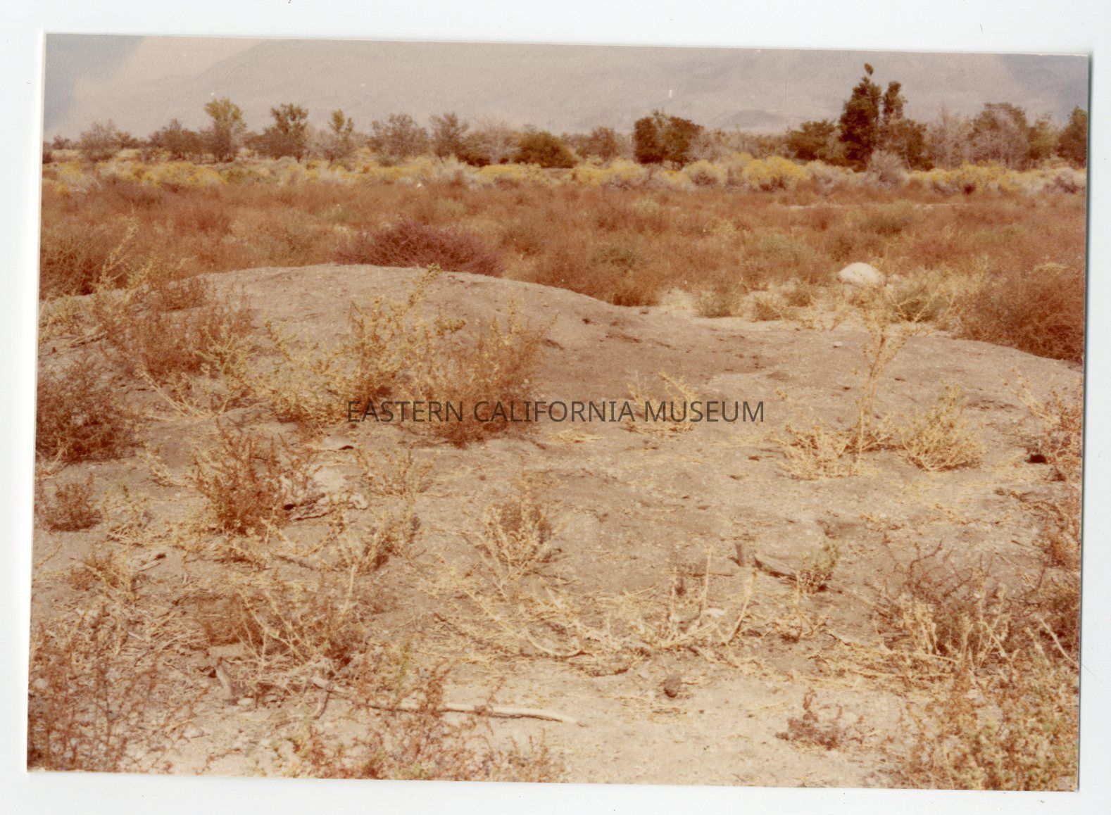 Color photo of some rocks and trees at Manzanar.