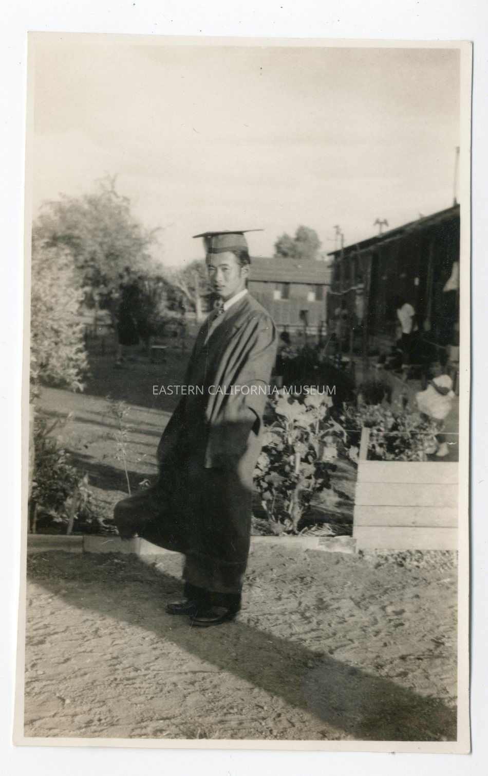 Photo of a young man wearing graduation robes and mortarboard. He is standing outside in front of a small garden with barracks in the background.