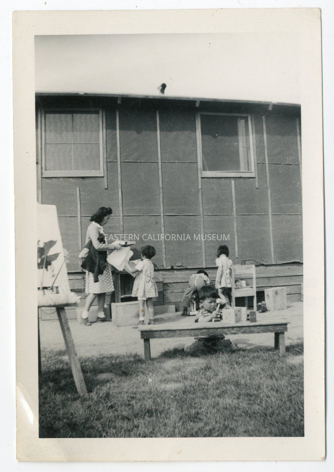 Photo of a woman with four small children doing crafts and playing outside of a barrack at Manzanar War Relocation Center.