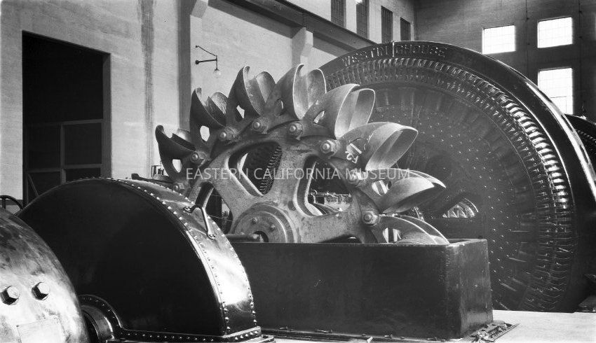 B & W digital scan of Pelton Wheel and Generator in unidentified LA Aqueduct Hydroelectric Plant, possibly San Francisquito, Unit # 1. Pelton Wheels extracted energy from the impulse of moving water, as opposed to its weight like a traditional overshot water wheel.