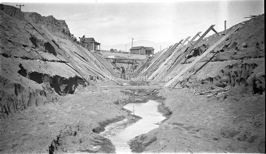 B & W digital scan of LA Aqueduct laborers prepping channel for concrete lining, Cottonwood Power Plant. Work being done on Olancha Division. Sides of channel eroded in foreground.