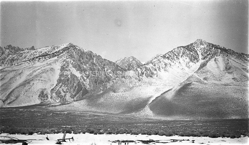 B & W digital scan looking from Owens Valley west to snowy Sierra Nevada mountain range with Sawmill Canyon located between the two peaks.