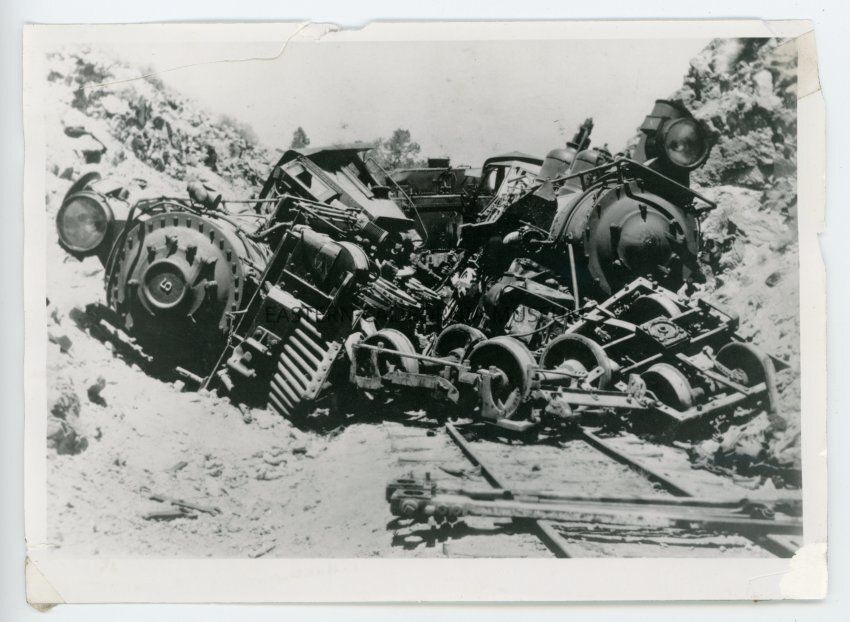 Photo of a train wreck involving Southern Pacific engines #5 and #8 near Mt. Montgomery on July 3,1923.Collection