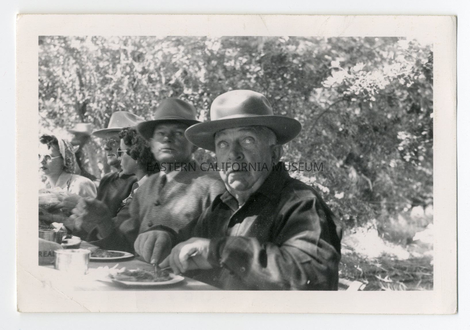 Photo of John Lubken sitting at a picnic table eating a plate of food. There are four other unidentified people sitting beside him.