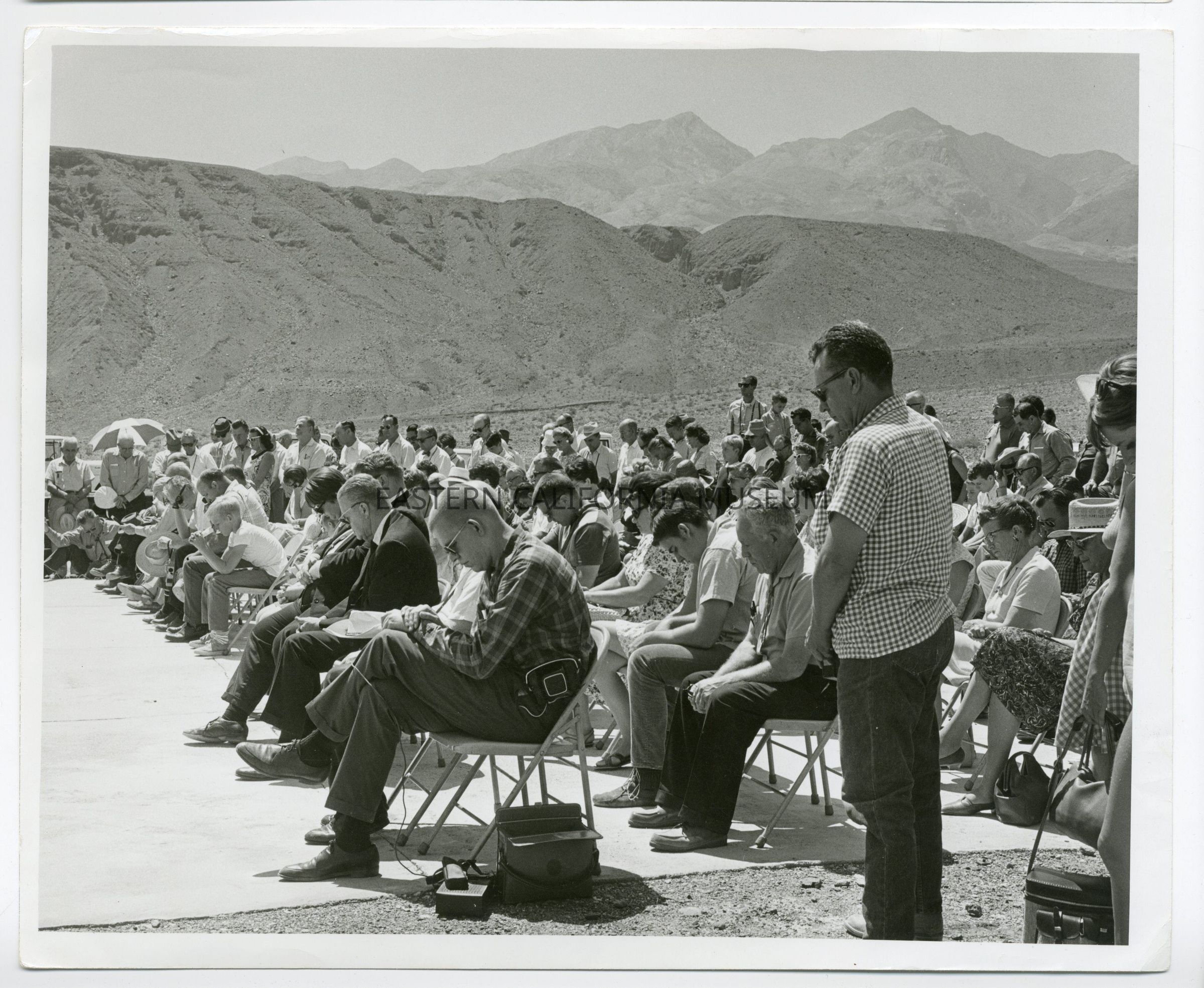 Photo of a large crowd of mourners (seated and standing) at Charles Ferge's (Seldom Seen Slim) funeral.