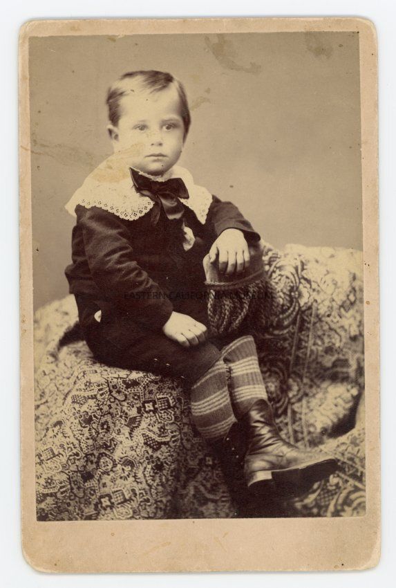 Mounted studio portrait of a young boy sitting on an ornate rug or carpet. He is identified on the reverse as Perl Tate.