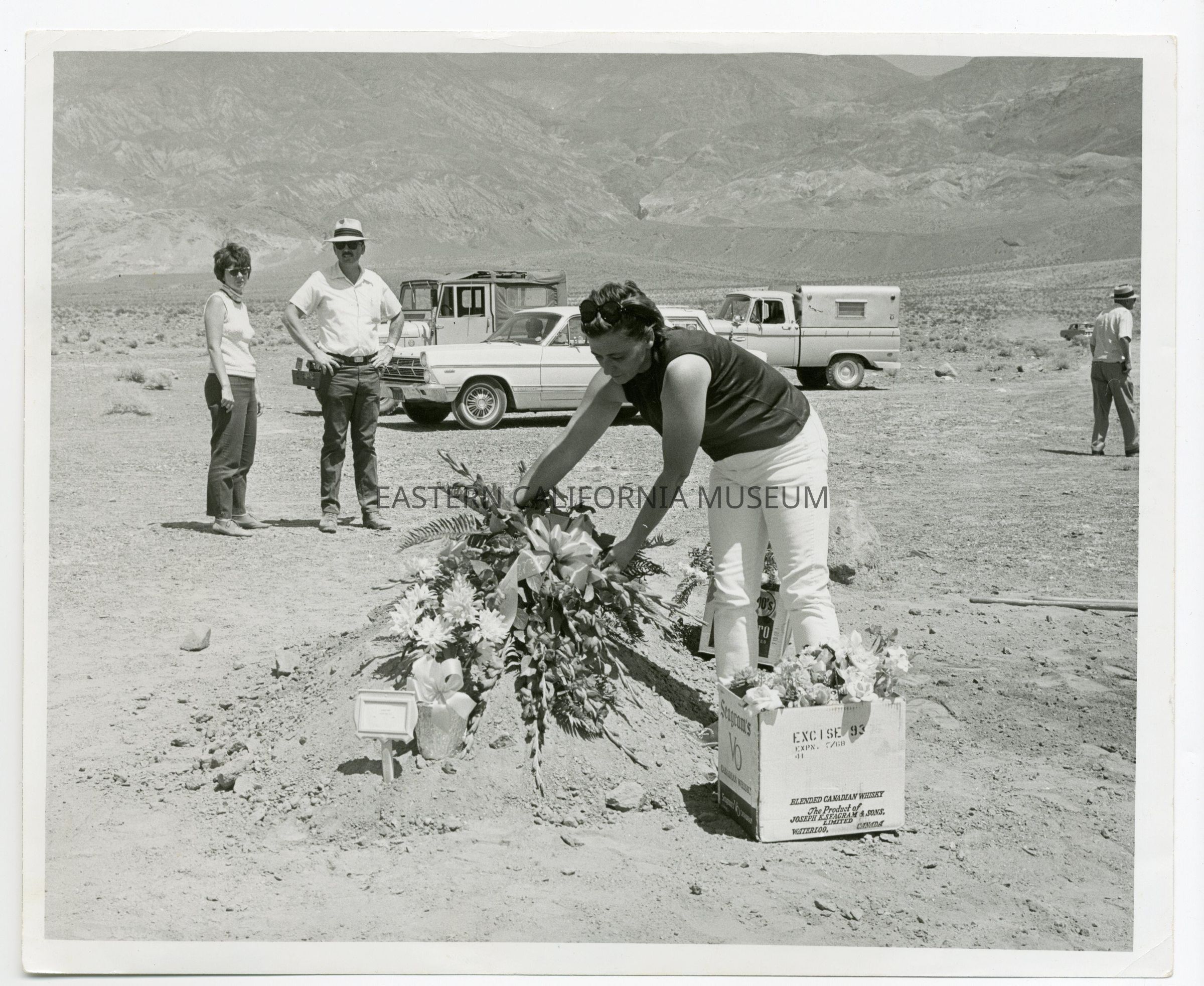Photo of a woman (identified as the donor, Florine Lawlor) placing a floral arrangement on the mounded earth above Charles Ferge's (Seldom Seen Slim) grave. There are three people and three vehicles in the background.Collection