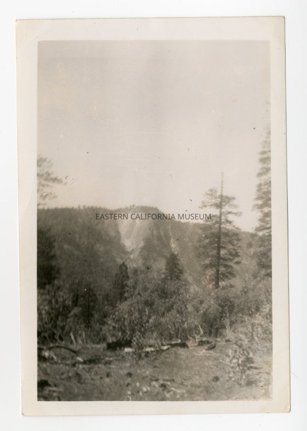 Black and white photo of trees and a mountain in the distance with an exposed rock face. Photo is blurry and indistinct.