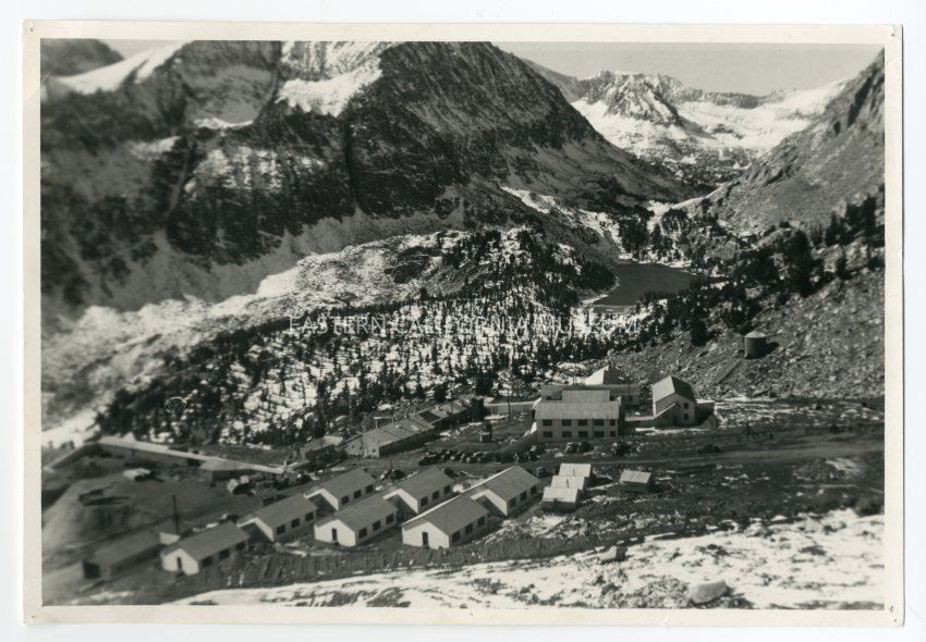 Black and white photo of numerous buildings, many identical, next to a lake surrounded by snow covered mountains. Many vehicles are visible. Could this be the Pine Creek/U.S. Vanadium Mine area? A plant or factory?Collection