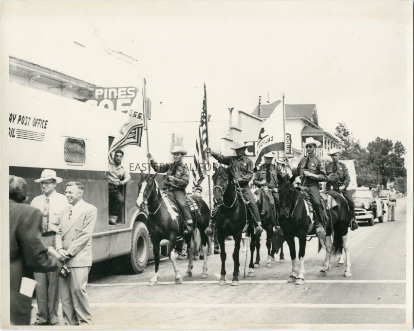 The Inyo County Sheriff's uniformed mounted posse met the Highway Post Office caravan a short distance south of Independence and escorted it to the Independence Post Office, thus depicting the era from the Pony Express to the present mode of transportation. Upon arriving at the Post Office, the Highway Post Office was on display and people had a chance to meet Mr. Pearson, Assistant Postmaster General, and other guests.