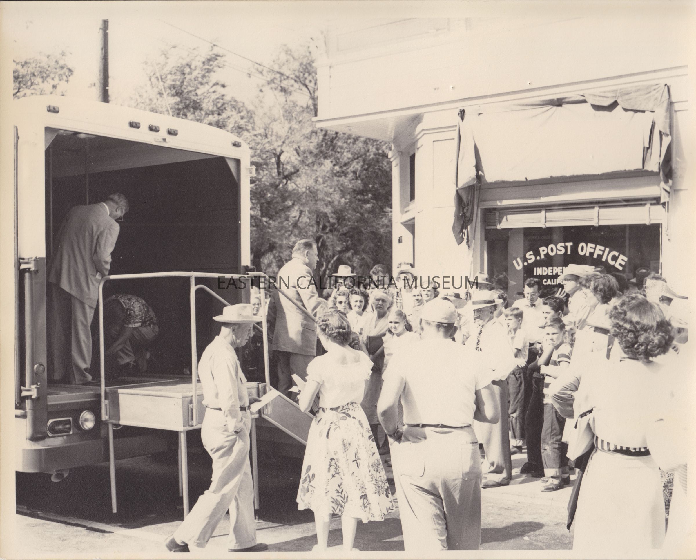 Black and white photo of a crowd gathered around the Highway Post Office (HPO) and the Independence Post Office. The HPO made a stop in Independence on its inaugural trip from Los Angeles to Bishop, July 14-15, 1952. Upon arriving at the Post Office, the Highway Post Office was on display and people had a chance to meet Mr. Pearson, Assistant Postmaster General, and other guests.