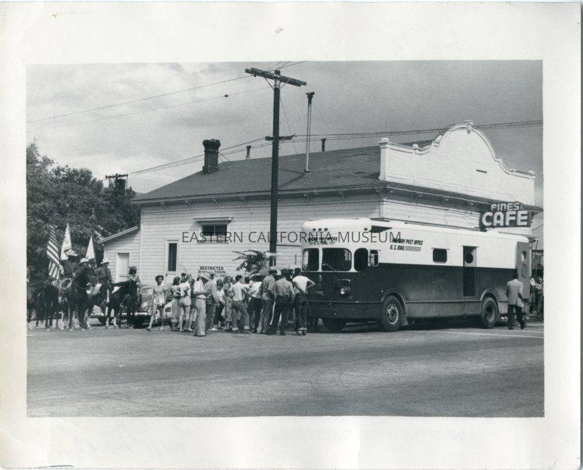 Black and white photo of a crowd around the Highway Post Office parked in front of the Pines Cafe. Mounted Inyo County Sheriff's posse on left side of photo. This was taken during the inaugural trip of the Highway Post Office from Los Angeles to Bishop. Ceremonies were held at all stopping post offices. On this inaugural trip Obsorne A. Pearson, Assistant Postmaster General, was present for festivites.