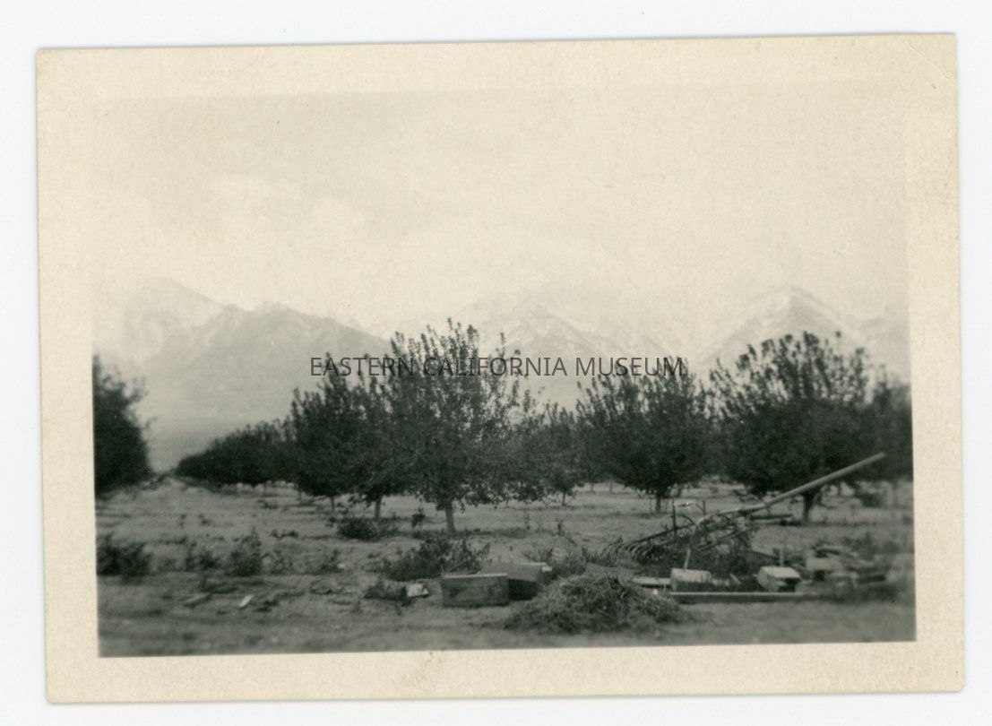 Photo of an orchard with the snow-covered Sierra Nevada mountain range in the background. Appears to be some equipment or debris in the foreground. Location is likely Manzanar.