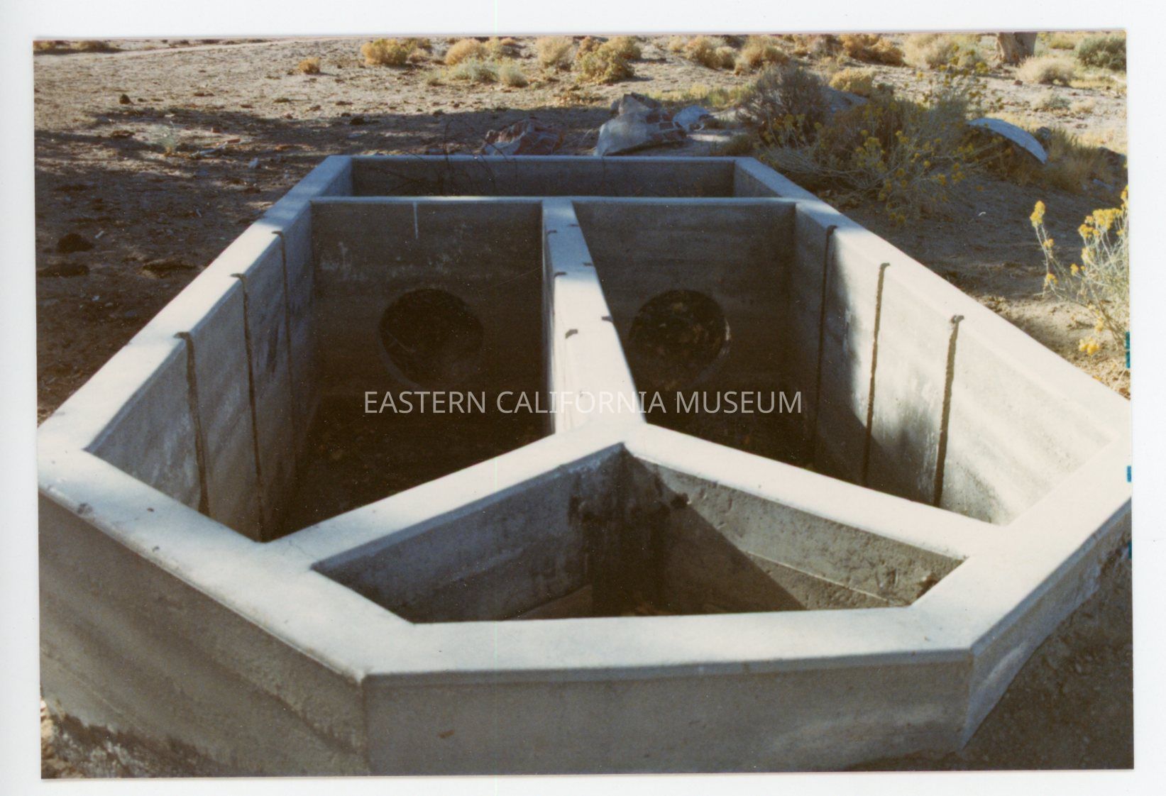 Color photo of a concrete basin in the ground divided into four parts. A label with it says, "Pump houses."