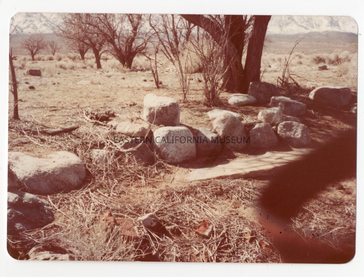 Color photo of a concrete step and line or border of rocks at Manzanar.
