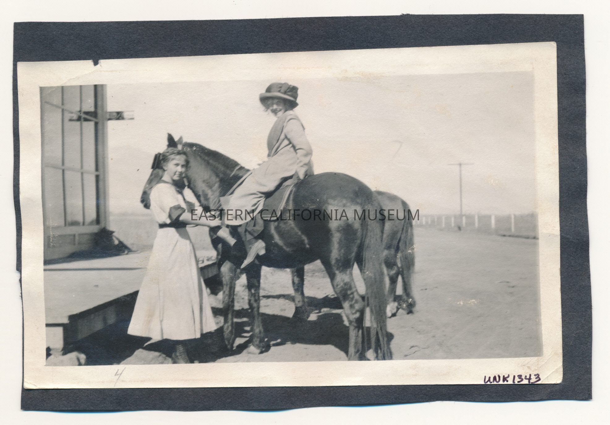 Photo of a woman mounted on a horse with another young woman standing beside her (there is a second horse hidden behind them). They are standing in front of a building and a raised wooden sidewalk, which has been identified as the Manzanar Store.