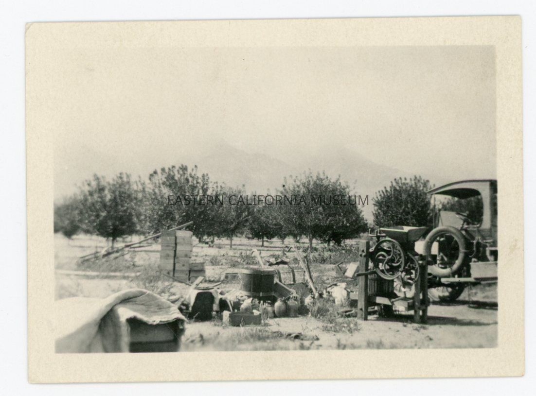 Photo of an orchard with equipment in the foreground. There is a tall stack of fruit crates, what looks to be a grinder, and a vehicle to the right. Location is likely Manzanar.