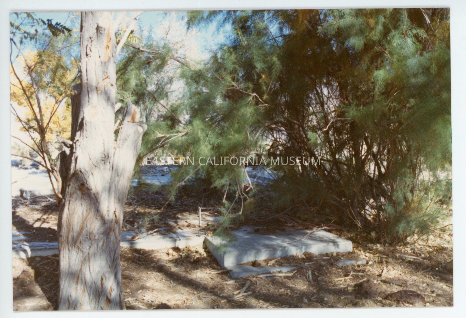 Color photo of concrete foundations mostly covered by trees and dirt. A label with it says, "Control house foundation (entrance)."